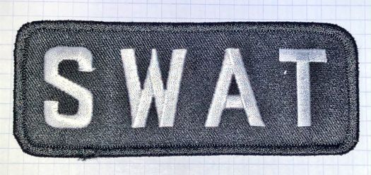 Broderet SWAT, blank hvid tråd på sort kantsyet stof 11,5 x 4,5 cm, hanvelcro bagside